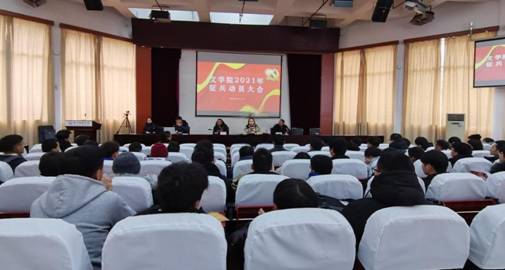 为响应省征兵办、校征兵工作,积极动员大学生参军入伍,加强征兵政策宣传,号召同学们积极参军入伍。12月17日,文学院在15栋圆心报告厅召开了2021年的征兵动员大会。文学院党委副书记刘笑玲(主持工作),文学院副院长吴电雷,副院长杨锋兵,文学院团委副书记赵晋,辅导员姚伦燚老师出席会议,文学院全体男同学及部分女同学参会。本次会议由赵晋老师主持。