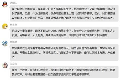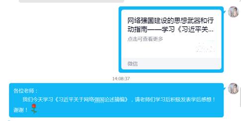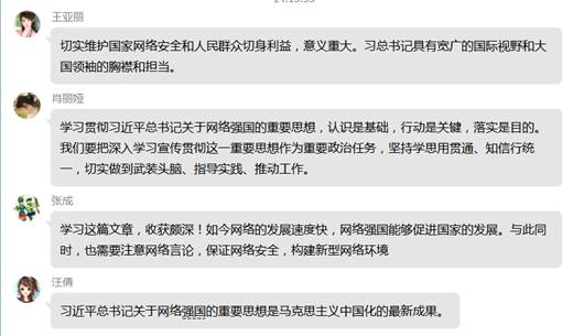 在学习过程中,老师们踊跃发表感想。扶平凡老师说到,数字化时代,每个个体都既是传播主体也是受众主体,用网管网治网是一个整体工程,也是对党的执政能力的考验。李勇老师说到,建设网络强国的战略部署要与“两个一百年”奋斗目标同步推进,向着网络基础设施基本普及、自主创新能力显著增强、信息经济全面发展、网络安全保障有力的目标不断前进。周艳老师说到,我们要在工作中深刻把握习近平总书记关于网络强国的重要思想的科学定位和重大意义,切实增强学习宣传贯彻的思想自觉、政治自觉和行动自觉。