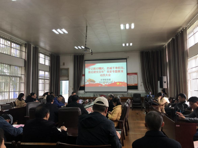 为深入学习贯彻习近平总书记在党史学习教育动员大会上的重要讲话精神,认真贯彻落实中央和省委、省教育工委、校党委以及院党委的决策部署,文学院于2021年4月16日在文学院会议室召开“牢记殷切嘱托,忠诚干净担当、喜迎建党百年”党史专题教育党员大会。学院全体党员同志参加。