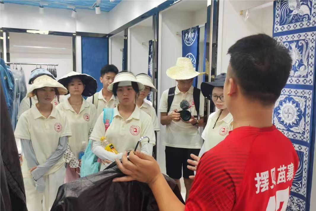团队首访非遗体验馆,了解“百鸟衣”、蜡染技艺及增收作用,发现体验馆直播出售农产品时存在语言沟通短板,遂为工作人员提供通用语言表达建议,助力提升带货效果。