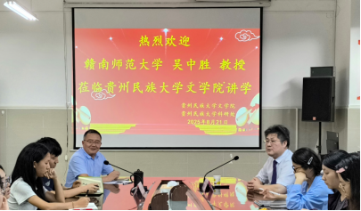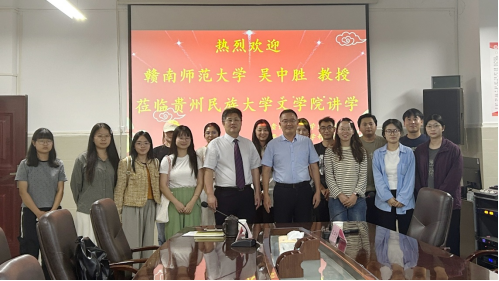 2025年8月21日晚,由贵州民族大学文学院主办的“学术前沿讲座第45讲·“‘龙学’的现代进程与当代取径”在文学院508会议室顺利举办。本次讲座邀请赣南师范大学吴中胜教授主讲,由文学院院长吴电雷教授主持,文学院部分教师、研究生参加。